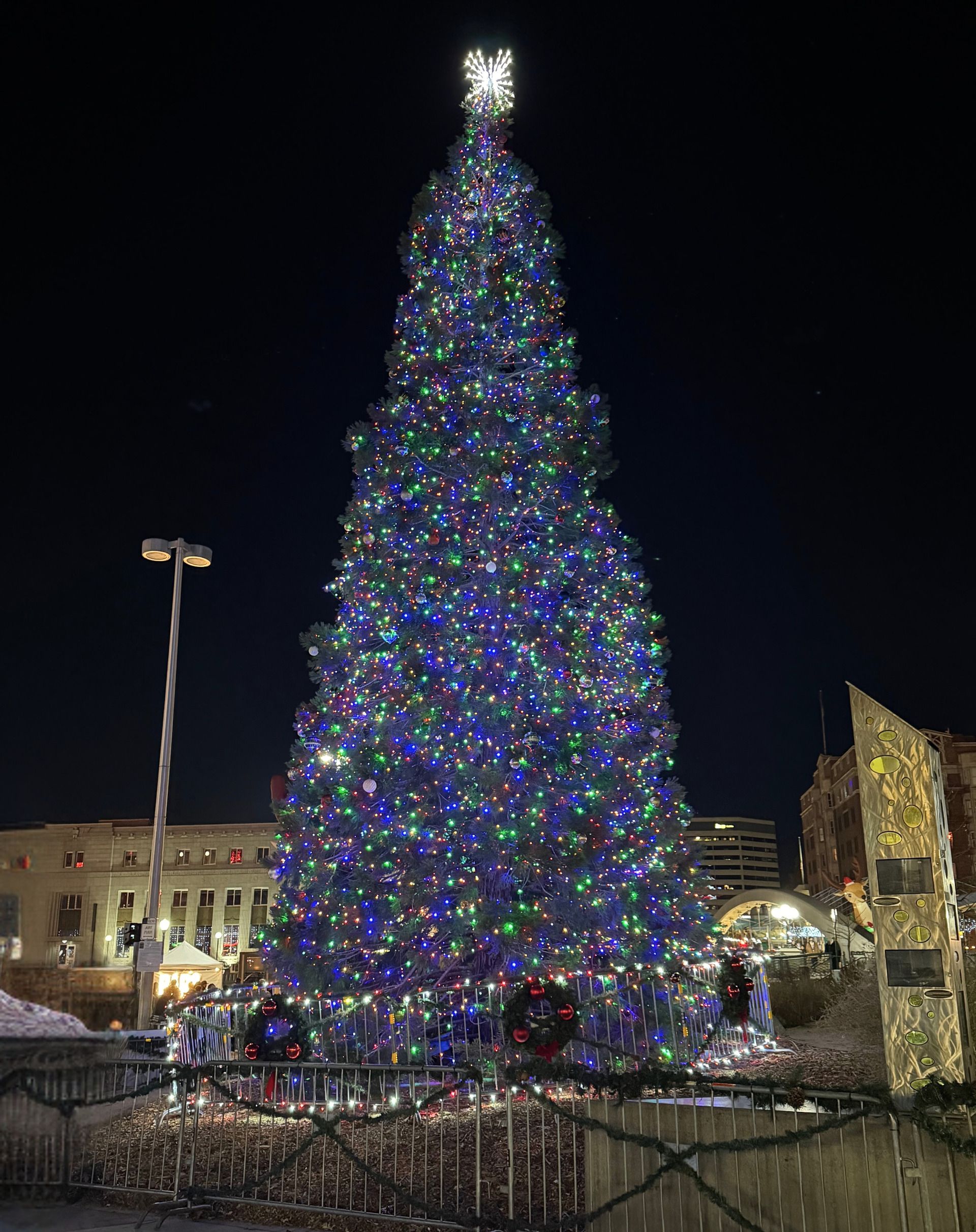 The Christmas tree at Reno City Plaza, along the Riverwalk