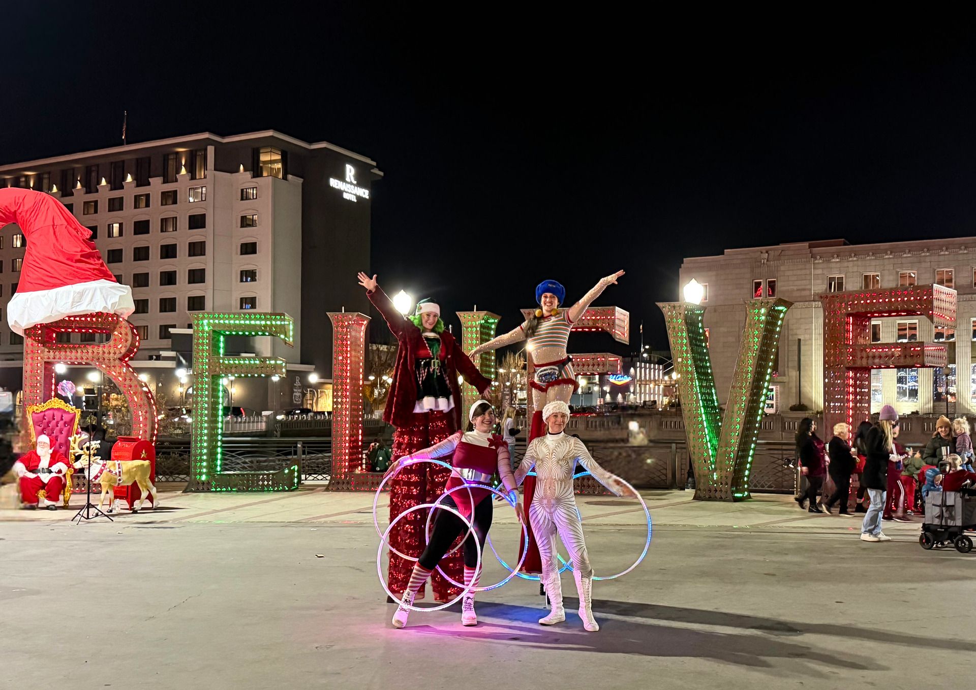 Last weekend we visited the Holiday Lights Festival at the Riverwalk District. The Reno Christmas Tree stood at the center of City Plaza. Vendor booths framed the walkway. Families waited for photos with Santa. Music from a local band drifted through the cold air. The river carried the light in long wavering reflections.