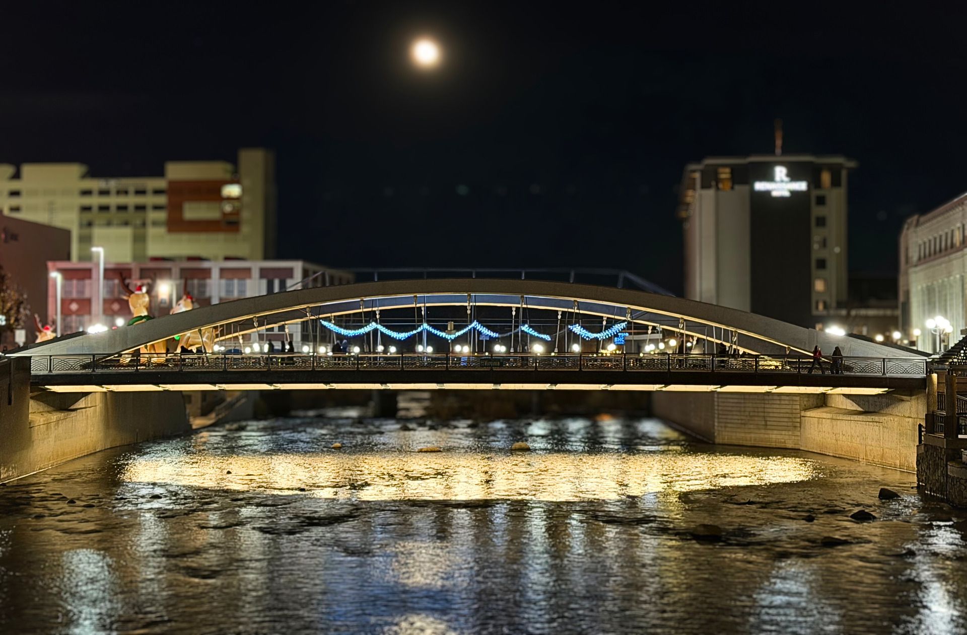 The bridge over the Truckee River, lit for the season, guiding us toward the Holiday Lights Festival