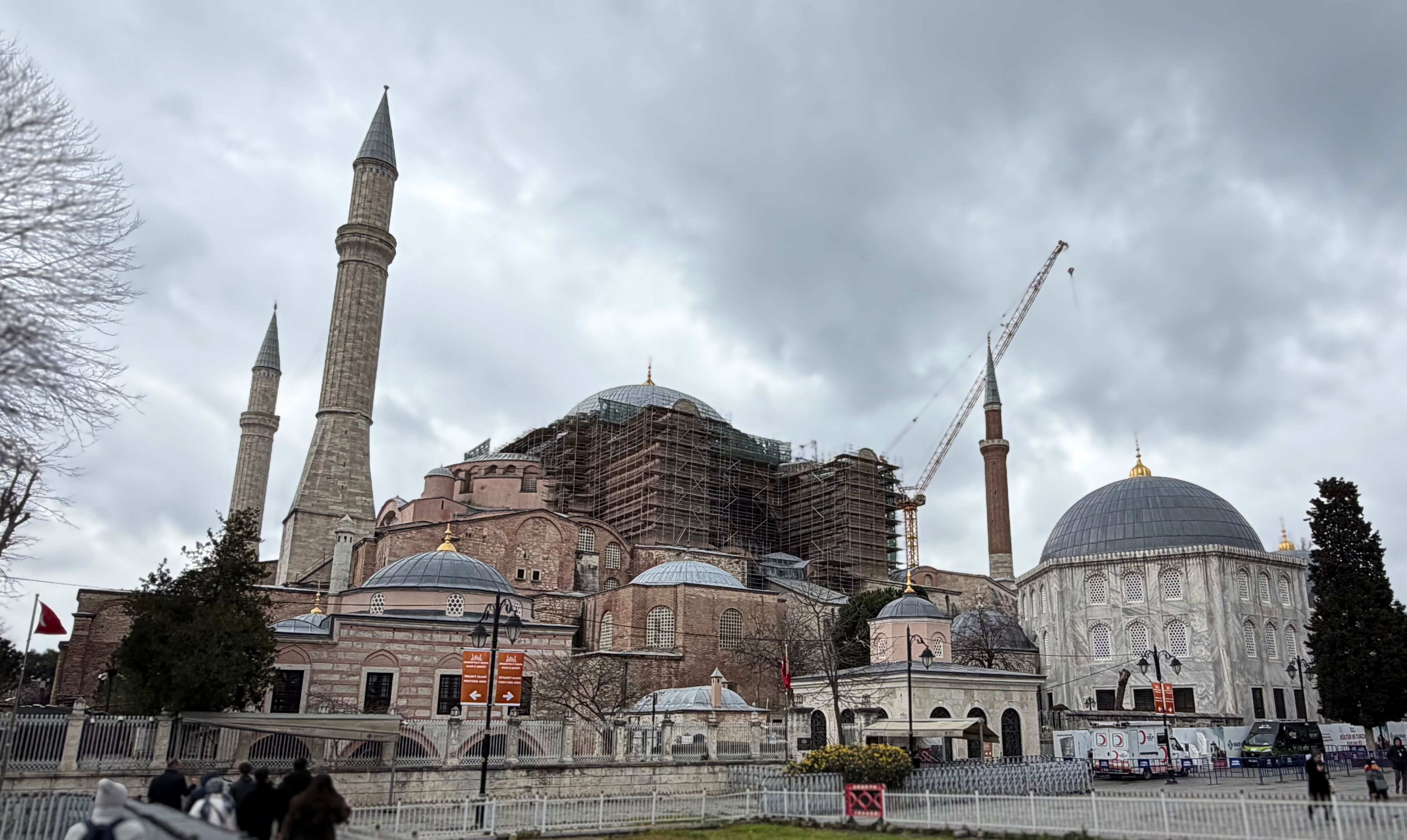 Our first encounter with Hagia Sophia, beneath the scaffolding that has so often accompanied its long history.