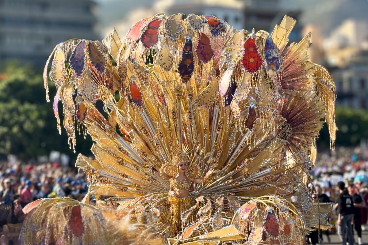 Carla Castro, Carnival Queen of Santa Cruz de Tenerife (2026), in “Icónica” (Alexis Santana), during the Coso Apoteosis grand parade.