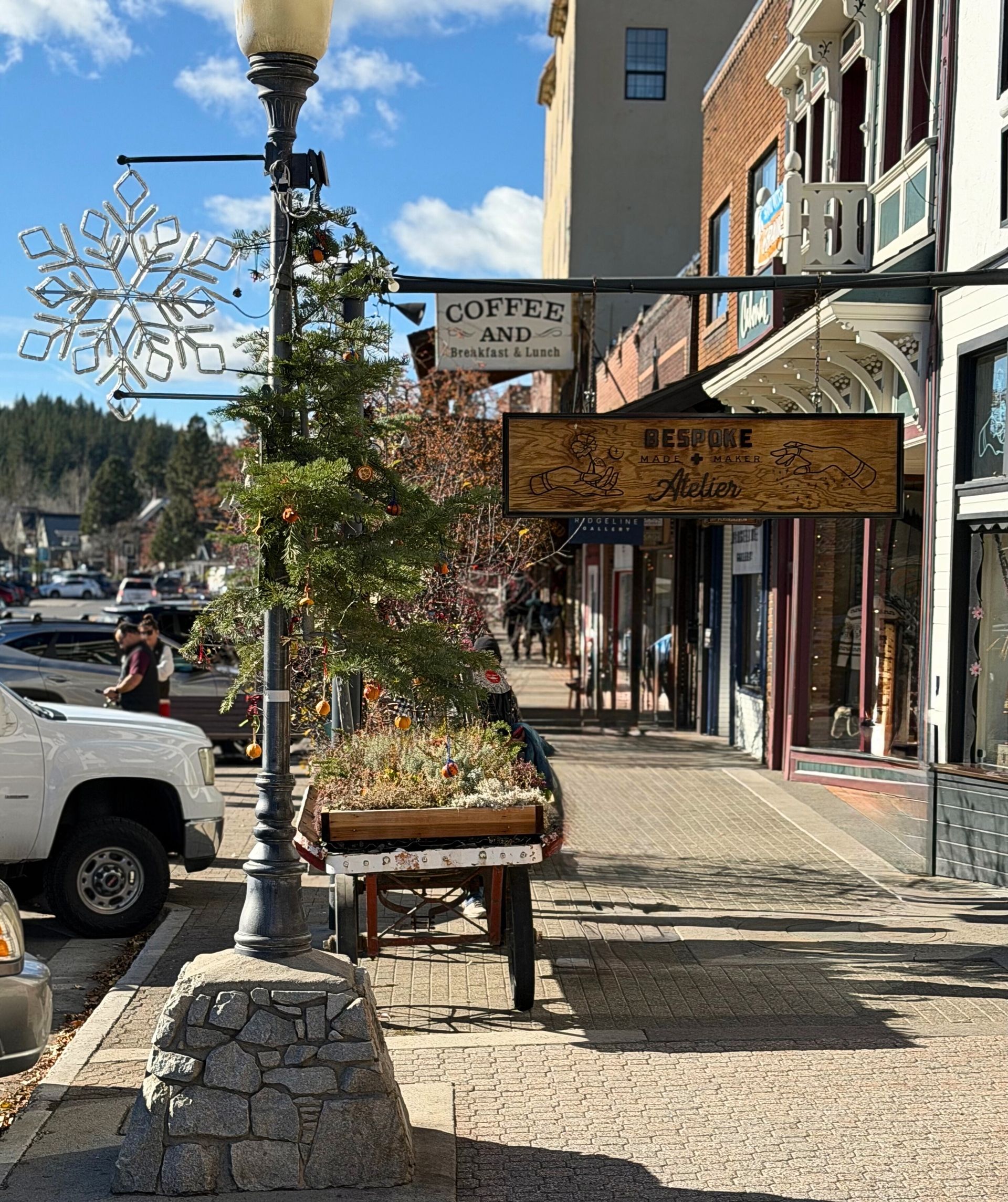 Main Street Truckee with signs of the season appearing along the sidewalks
