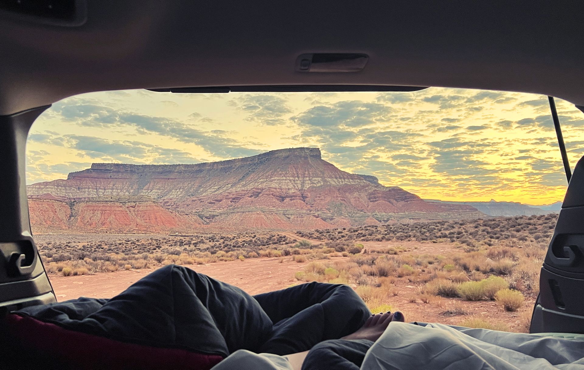 Free room with a view: Hurricane Cliffs at sunrise, car camping near Zion.